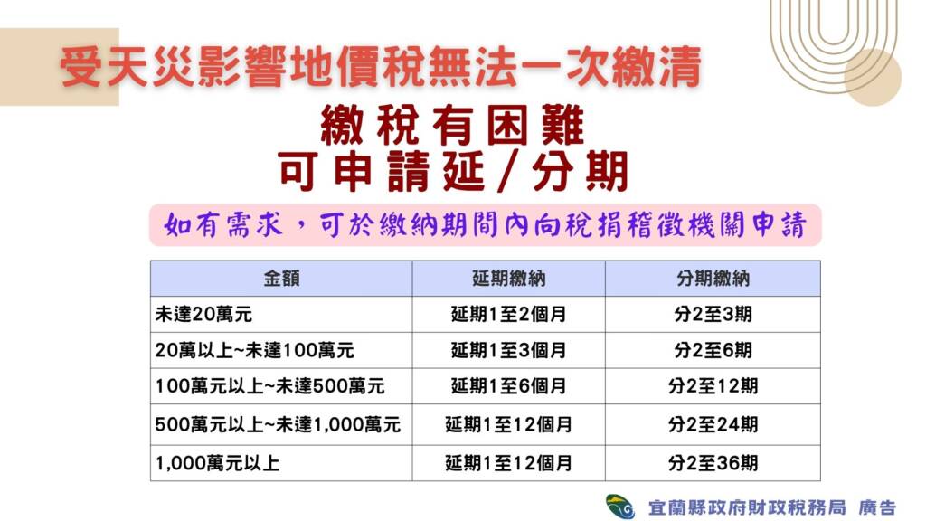 【北台灣新聞中心】 宜蘭縣政府財政稅務局表示,今年(114年)地價稅已於11月1日起開徵,惟近日受鳳凰颱風影響,縣內部分地區發生災情。受災民眾及企業因受天然災害影響致無法於規定繳納期間內繳清稅捐 …