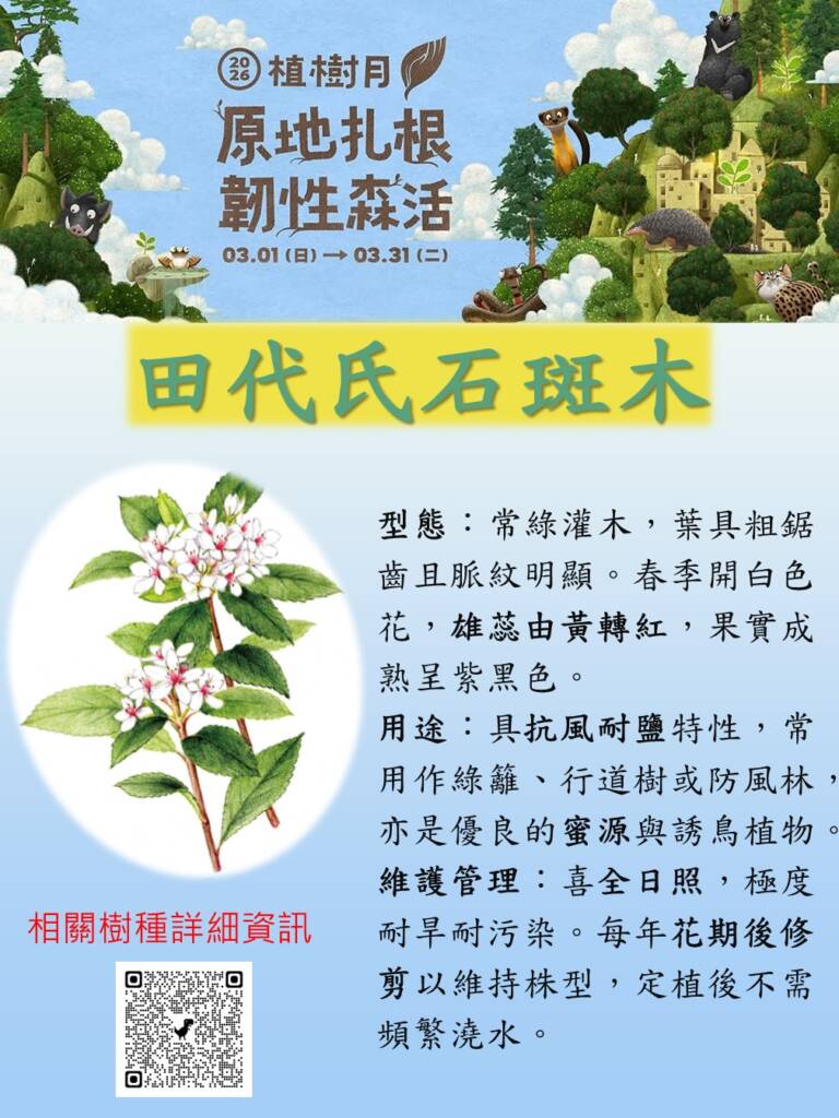 三月是植樹月,林業及自然保育署宜蘭分署邀請民眾響應115年植樹月「原地扎根 韌性森活」主題活動,推廣臺灣原生植物,今(115)年宜蘭分署將於3月5日啟動轄內各地區植樹及贈苗系列活動,預計有23場次,推廣發送烏來杜鵑、田代氏石斑木、桃金孃、山黃梔、金毛杜鵑、細葉山茶、竹子山十大功勞等多種樹苗,總計1萬餘株臺灣原生樹種苗木,歡迎民眾踴躍參與,一同建構國土生態綠色網絡,營造臺灣生態廊道,亦讓都市一起綠美化。