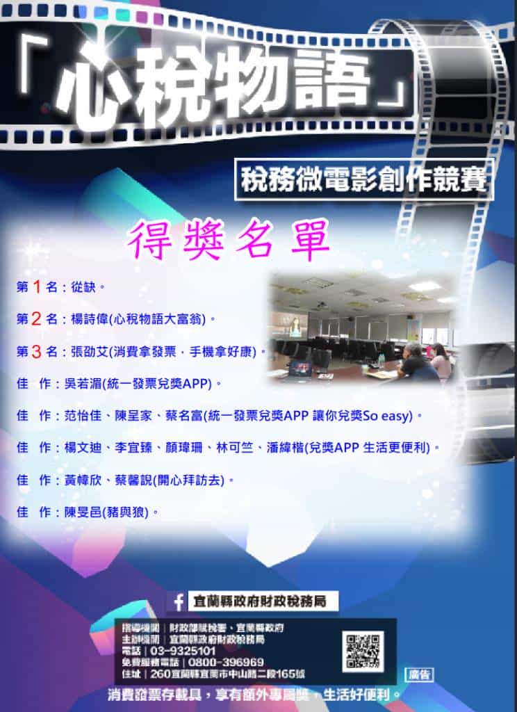 「心稅物語」稅務微電影創作競賽得獎名單出爐 Posted on2020-06-102020-06-11Autor北台灣新聞網留下足跡 [記者林美玉/宜蘭報導] 宜蘭縣政府財政稅務局「心稅物語」稅務微電影創作競賽得獎名單出爐(如下圖) 分享此文:FacebookTwitterPinterestPocket