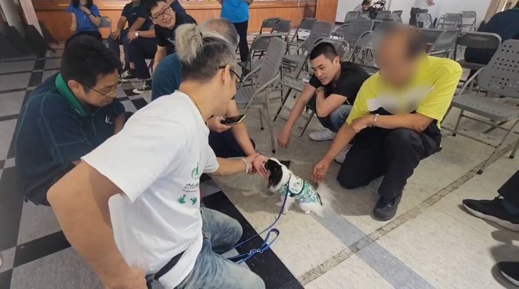 當Eros 與Pepper 穿著小背心、輕快踏進廠區,宛如毛絨絨的陽光,立刻吸引員工們紛紛圍上前來。在動物輔助治療師的專業引導下,大家與治療犬互動、餵食、輕撫,也一同完成簡單指令,彼此眼神裡充滿驚喜與溫柔。現場不時響起笑聲與讚嘆,員工們臉上浮現久違的輕鬆神情,有人開心地表示:「原本一早壓力很大,和狗狗接觸後,整個人都鬆了下來,像被擁抱了一樣。」