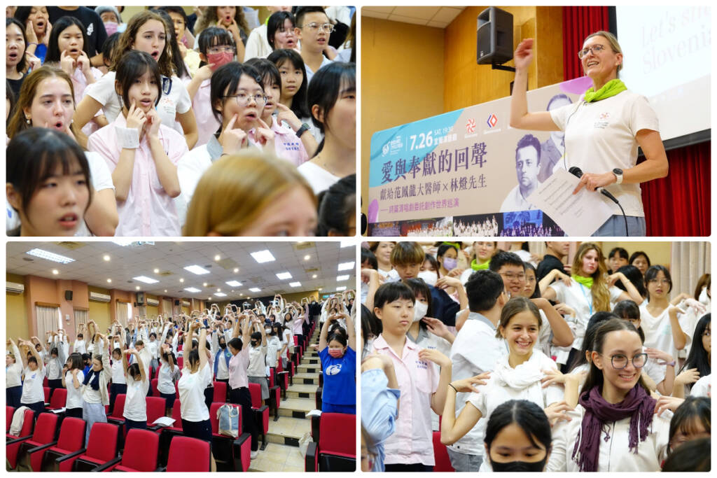 (上圖及下圖:來自斯洛維尼亞的合唱指揮祖潘契琪,於蘭陽女中展演廳親自主持大師班,帶領宜蘭在地與國際青年合唱團員,以身體律動探索聲音的表達與共鳴。)