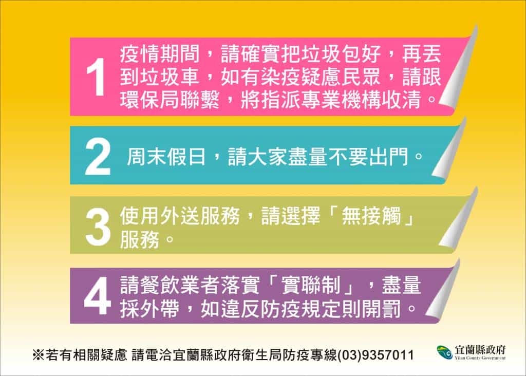 今(22)日宜蘭增加3例確診個案,案3287、案3517及案3518,縣府目前已進行相關個案的追蹤管理。林姿妙縣長提醒,有染疫疑慮的民眾若須清運垃圾,請與環保局聯繫,縣府將指派專業清除機構處理,大家一起保護疫情期間依舊辛勤為大家清運家庭的垃圾清潔隊員。