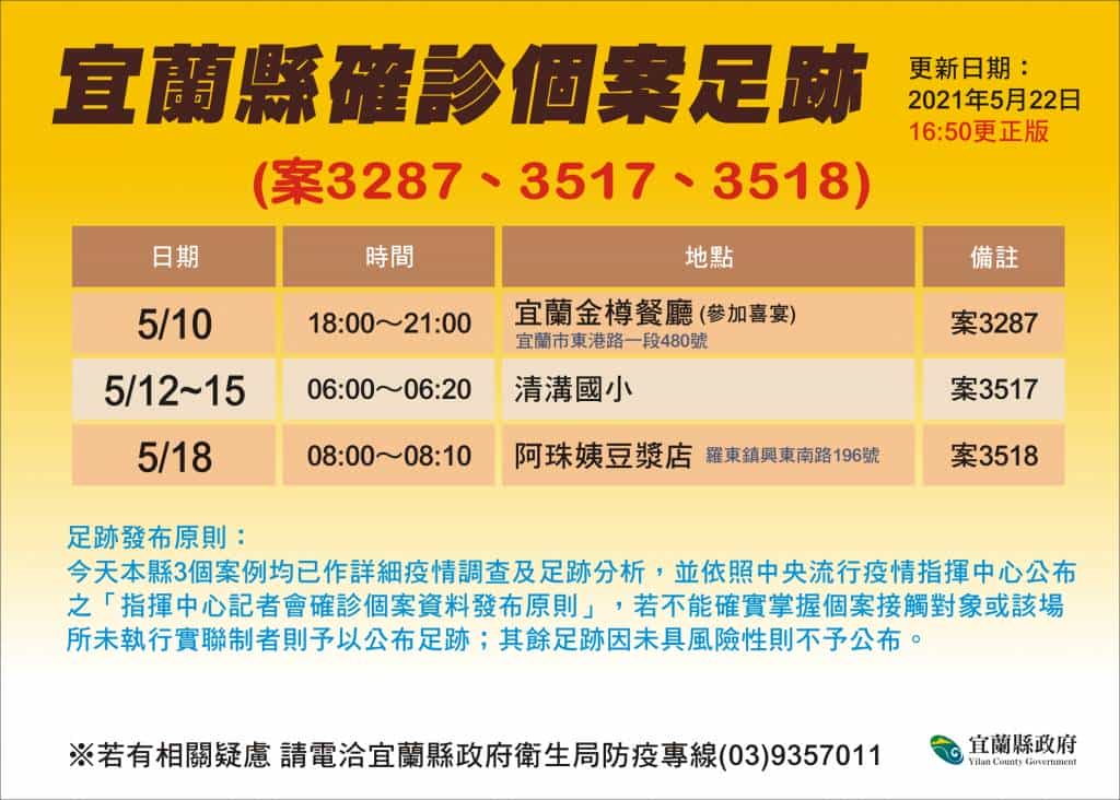 案3518號為70多歲男性,其平日居住在新北市中和區,5月13日返回宜蘭獨居,5月19日出現味覺異常,20日由友人自行駕車到醫院急診採檢,於今(22)日確診,友人隨即列為居家隔離,CT值為17。