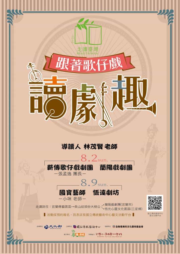 今年度由國立傳統藝術中心與傳統戲曲專家林茂賢老師共同策劃歌仔戲走讀路徑,特邀國寶藝師小咪及國寶藝師廖瓊枝接班人張孟逸以讀劇、講唱示範及深度對談分享歌仔戲文化,並走訪宜蘭在地歌仔戲劇團蘭陽戲劇團及悟遠劇坊,深入排練基地,觀賞經典劇目片段並進而體驗學習歌仔戲曲調、身段、扮相…等奧秘,活動將於8月2日及8月9日辦理,即日起開放報名!