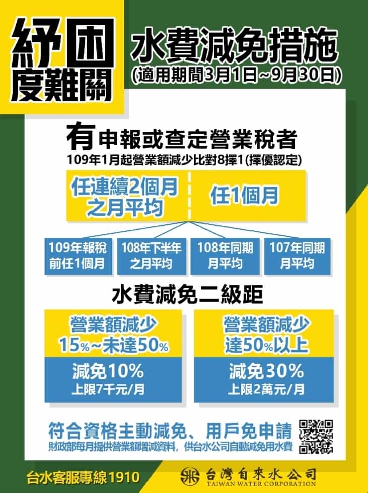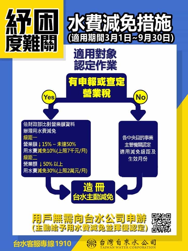 台灣自來水公司依照3月12日發布的「經濟部對受嚴重特殊傳染性肺炎影響發生營運困難產業事業紓困振興辦法」規定,針對製造業、服務業及其他經主管機關認定之產業,主動辦理用水費減免,減免自109年3月1日起的水費,只要是有商業登記且經國稅局比對營業額減少符合的用水戶,無需申請,即可在5月份以後的水費單據獲得減免。