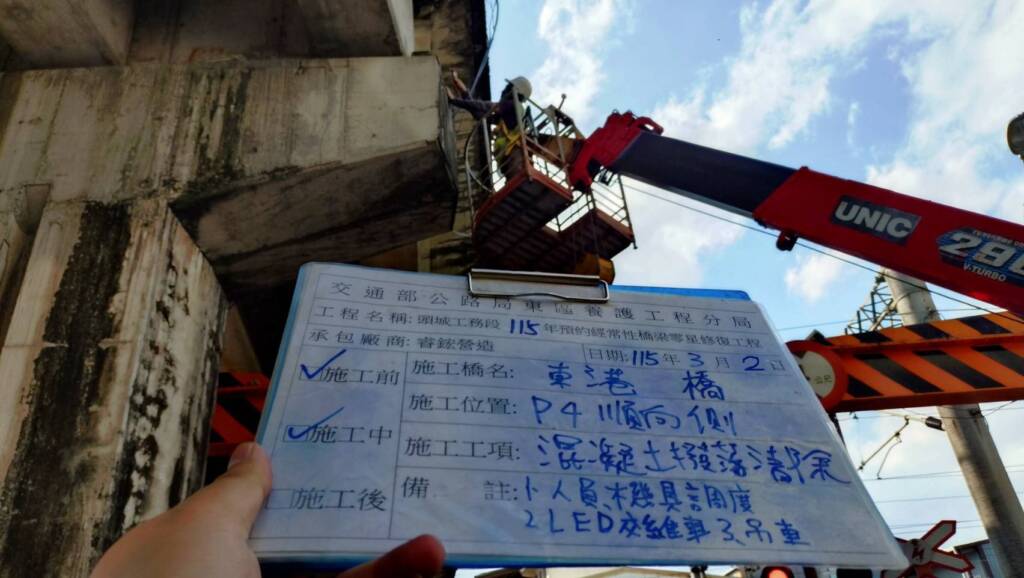 有關用路人反映位於宜蘭市台7線121k+500東港陸橋部分結構物發生水泥剝落一事,經東分局派員檢修勘查,研判該陸橋部分結構似因近期持續性地震或天候潮濕等原因,造成陸橋橋下部分混凝土輕微剝落,為免影響用路人通行安全,公路局東區養護工程分局頭城工務段立即於3月2日進場維護,並採預防性橋梁維護改善作業,全面檢視東港陸橋各部結構物是否有類似情形,避免類似案件發生,敬請用路人諒察。