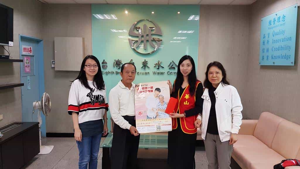 台灣自來水公司第八區管理處,響應華山基金會員山站於歲末年終舉辦「愛老人 愛團圓 愛心年菜」募款活動,號召同仁共襄盛舉,募集金額 15,600 元,購買十樣年禮(原味香腸、苗栗紅棗、白木耳、麵線、紫菜、帶殼花生、芝麻荖、年糕、肉鬆、肉燥)、春聯、元宵、手做年禮(圍巾、圍脖)、環保提袋等,贈送弱勢長輩當作春節年禮,以補足長輩過年食物短缺,讓他們在年節能夠享有同樣歡樂的年味,也讓長輩感受到社會的關懷及溫暖。