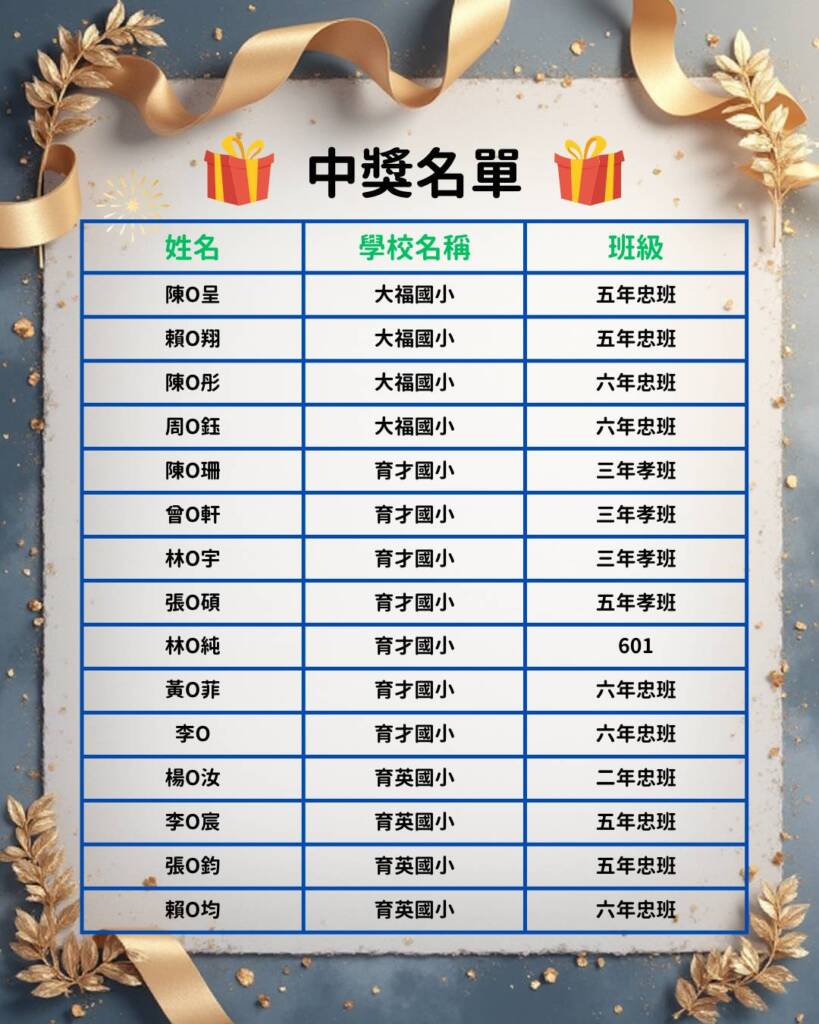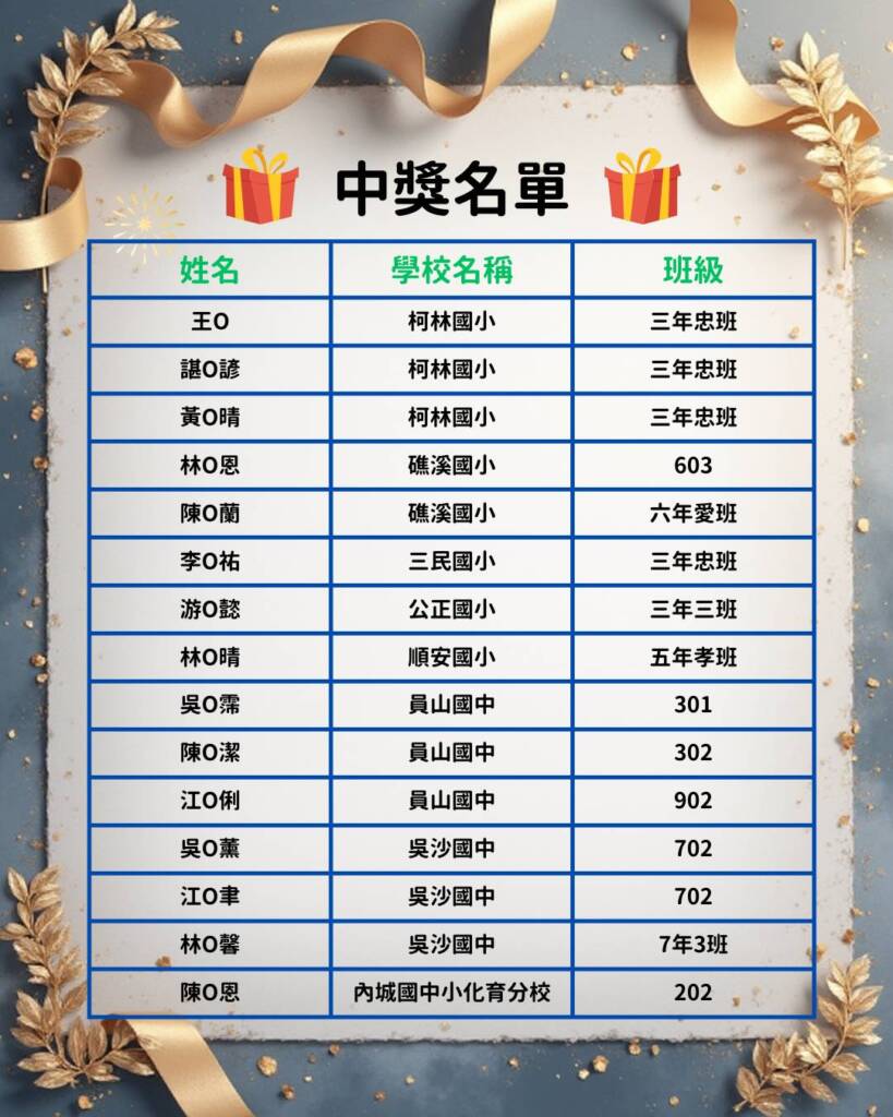 中獎名單可上該局網站(www.iltb.gov.tw)或FB粉絲專頁查詢,亦可撥打該局電話03-9325101轉111,或免費服務電話0800-396969洽詢。
