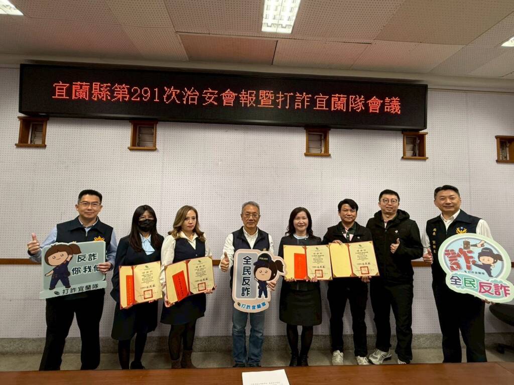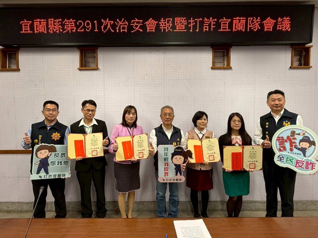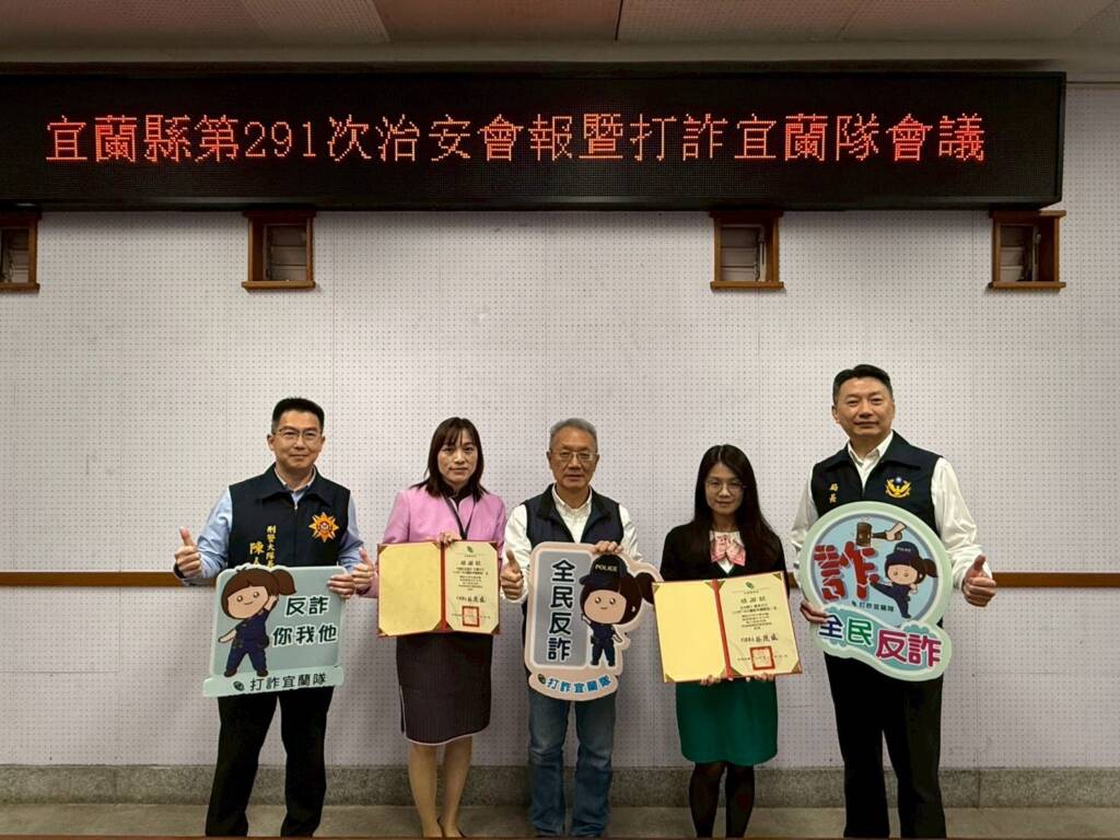 宜蘭縣政府為感謝金融機構積極攔阻詐騙案件,代理縣長林茂盛於本(12)月16日藉由治安會報表揚機警行員之義行,並頒發感謝狀予有功人員,期望透過公開表揚方式,強化全民打擊詐欺犯罪信心,暢通警民良好之通報機制。