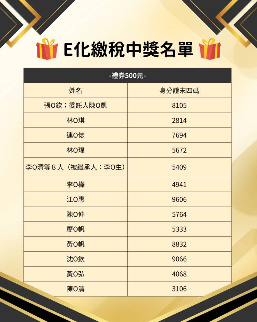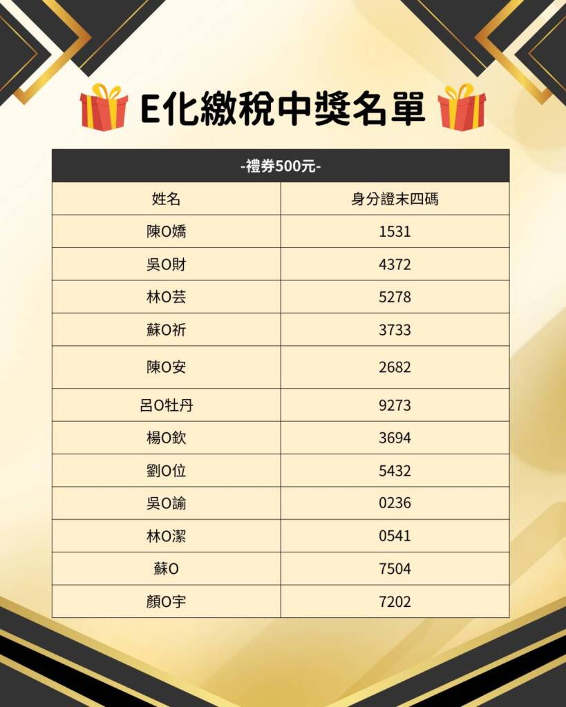 為鼓勵民眾使用更便利繳稅方式,宜蘭縣政府財政稅務局辦理「114年地價稅E化及長期約定轉帳繳稅送好禮」活動,12月10日在政風人員全程見證下完成實體抽獎!分別抽出全聯禮券2,000元2名及500元25名,合計 54 名幸運中獎民眾!即日起將以公文掛號方式通知得獎人,記得留意信件並依指示完成領獎喔!