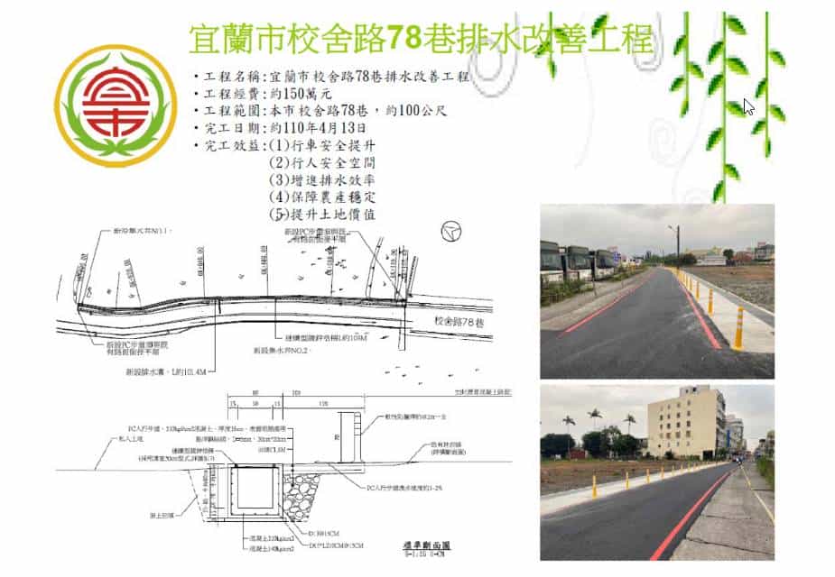 宜蘭市校舍路78巷排水改善工程施工路段位於校舍路78巷旁農田灌溉的土溝,常有丟棄的垃圾及雜物導致排水不良,經與行政院農業委員會農田水利署會勘協商後同意改善施做排水溝,改善長度約100公尺,經改善後將前後段排水溝做銜接,使其整體排水系統更加完整。