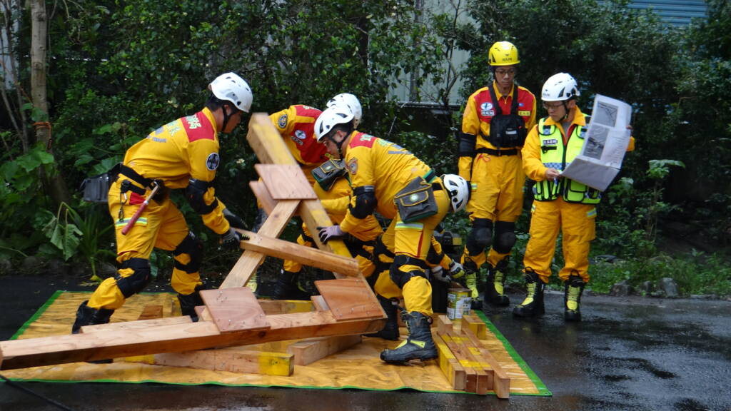 「搜索救援組」負責災害現場搜索與救援任務,能力涵蓋科技搜索、支撐技術、破壞技術、重物搬移及繩索技術等五大項,並須具備22項單項救援技術;本次展示牆面支撐、斜面破壞及繩索救援等項目,呈現面對複合型災害時的專業應變能力。