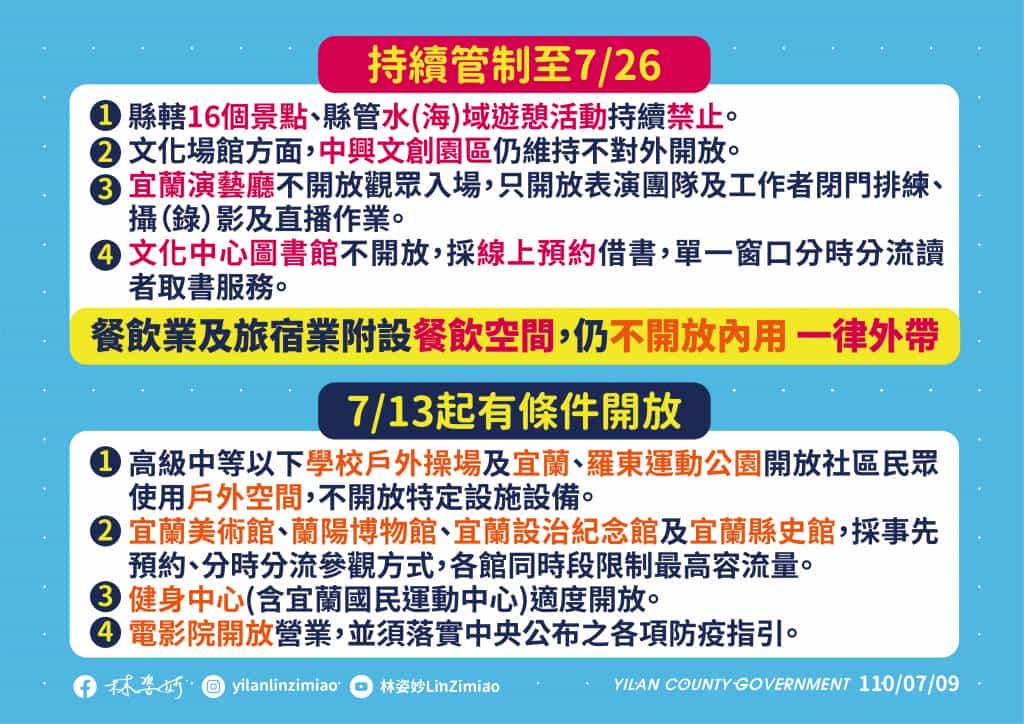 此外,7月13日起,高中以下學校戶外操場及宜蘭、羅東運動公園,開放社區民眾使用戶外空間但不開放特定設施設備;健身中心(含宜蘭國民運動中心)也依中央規定適度開放(包含團體課程及教練進行一對一教學課程),但仍須遵守各項防疫管制措施;電影院則依照文化部公布的指引,同時建議分廳、縮短營業時間、縮減播映場次等方式,進行人流管制。
