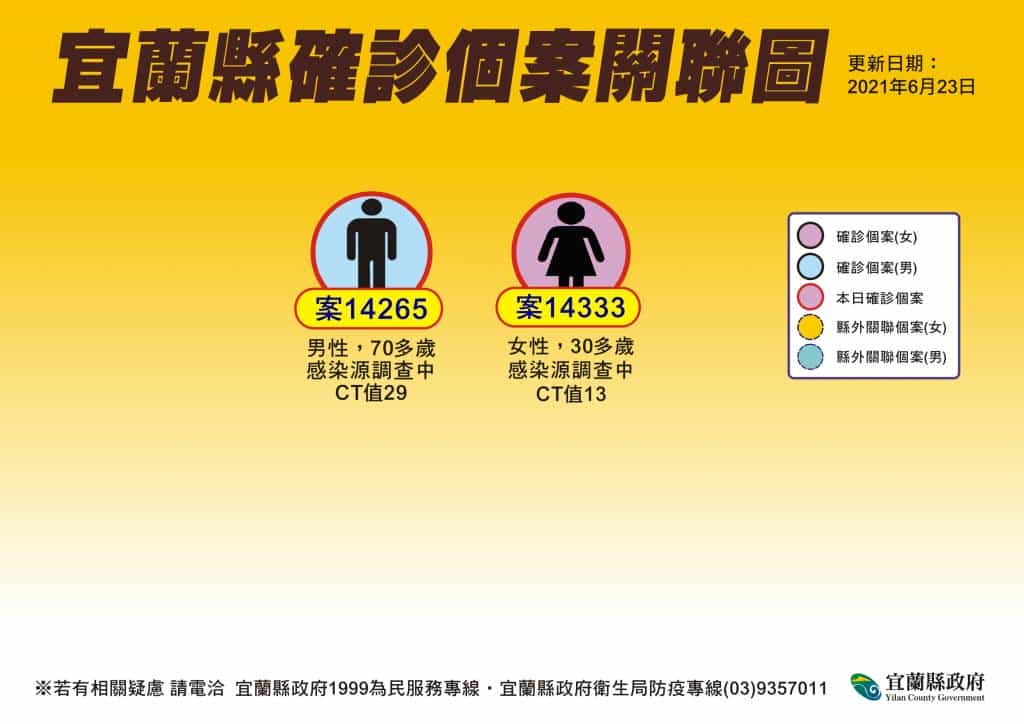 14265為70多歲男性,是長年定居美國的退休人士。109年12月案妻參加美國教會平安夜聚餐,聚餐中有人確診,個案及案妻後有發燒、咳嗽等症狀,均確診。因症狀輕微,在居家隔離觀察未住院治療。個案及案妻於110年3月在美國居住地的藥局完成2次BNT疫苗施打。5月7日在美國居住地篩檢PCR為陰性,5月10日搭機回臺灣,即入住防疫旅館。之後在外縣市居家檢疫至5月27日,搭乘防疫計程車回宜蘭。原預計6月底返回美國,因出國要持離境前3天的檢驗報告,個案於6月21日自費採檢,報告結果為陽性,CT值29。該案在6月22日確診後,衛生局已匡列2位同住家人(案妻、案親友)為居家隔離對象並採檢,結果皆為陰性。