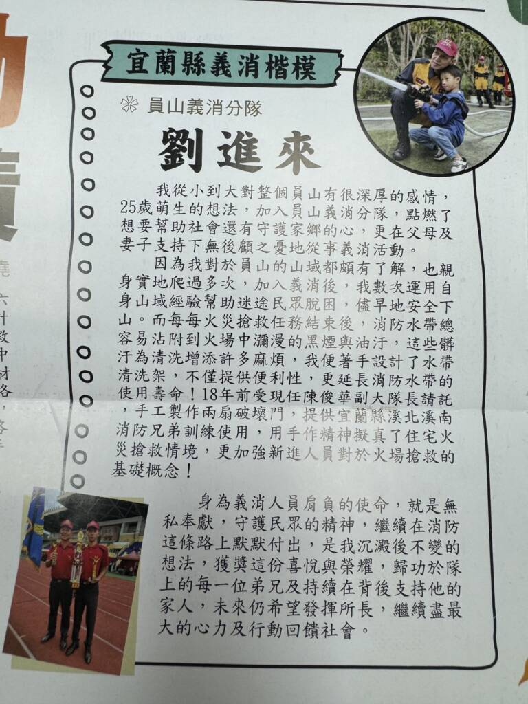 目前擔任員山義消分隊長的劉進來,從小到大對員山有著深厚的感情,25歲時自發性加入距離住家一公里遠的員山義消分隊,慢慢點燃了想要幫助社會還有守護家鄉的心,在父母及妻子支持下無後顧之憂地從事義消工作,因為本身是個土生土長的員山囝仔,對於員山的山域都頗有了解,數次運用自身經驗幫助迷途民眾儘早脫困。此外每每在火災任務結束後,消防水帶容易沾附黑煙與油汙,劉進來分隊長便著手設計了水帶清洗架,不只提供了清洗水帶上的便利,也因此延長了水帶使用壽命。民國97年更手工製作兩扇破壞門,提供宜蘭縣各分隊之消防兄弟訓練使用,擬真了住宅火災搶救情境。在許多救災現場劉進來分隊長更是極力發揮犧牲奉獻精神,用心努力地完成每次救援行動。
