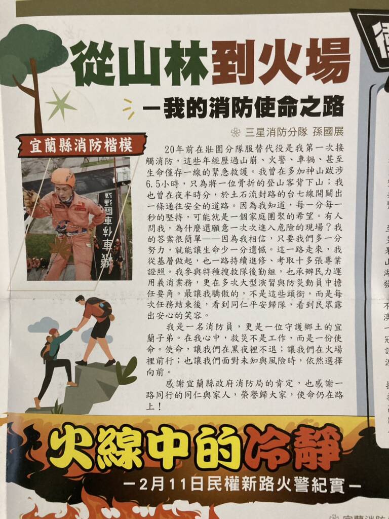 三星消防分隊隊員孫國展,自壯圍分隊擔任替代役起踏入消防,將近20年的消防歲月中,經歷過山崩、火警、車禍、甚至生命僅存一線的緊急救護,國展曾在多加神山跋涉6.5小時,只為將骨折的登山客背下山;也曾在夜半時分,於土石流掩覆的台七線開闢安全的道路,一路走來持續進修考取十多張專業證照,更參與特種搜救隊後勤組,於多次大型演習與防災動員中擔任要角。