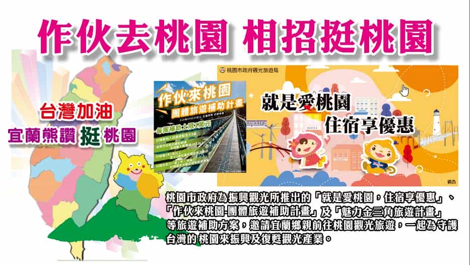 在部桃危機解除及當前疫情趨緩下,為鼓勵民眾前往桃園旅遊,振興復甦桃園地區的觀光產業,桃園市政府針對自由行旅客推出了「就是愛桃園,住宿享優惠」的旅遊補助計畫,提供自由行旅客每人最高2,000元住宿優惠,鼓勵民眾留宿桃園,同時也就團體旅遊的部分,規劃了「作伙來桃園-團體旅遊補助計畫」的旅遊補助,邀請宜蘭的旅行業者帶領宜蘭鄉親深入桃園的經典小鎮及特色景點;同時為了擴大自由行民眾的參與,重振桃園觀光熱潮,還加碼讓民眾可以免費參加「魅力金三角一日遊」的行程,民眾不僅可體驗機場偽出國購買免稅商品、感受桃園特色景點外,還可以優惠加購Xpark門票,一覽全台第一座都會型水生公園的魅力。