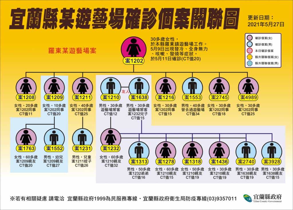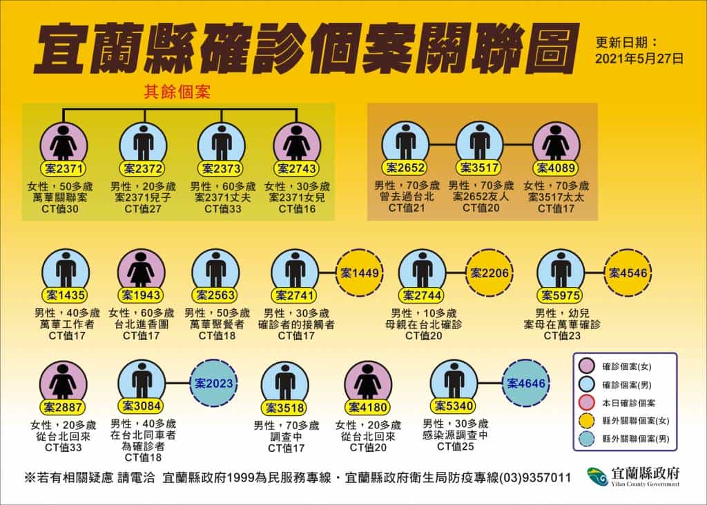 案6211為60多歲男性,之前待在台北,曾經去過許多地方用餐。5月16日回到宜蘭的家中,5月17日至案5341家中喝茶、聊天,5月18日出現症狀。由於症狀持續,且案5341確診,5月24日到醫院採檢後確診,CT值17。