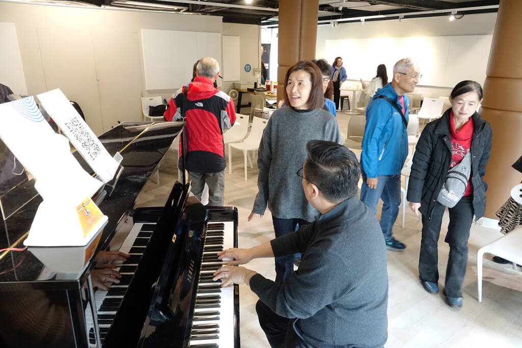 (下圖-「蘭燈合唱團」團員見面會現場,團員在鋼琴伴奏下即興試唱,提前感受合唱的音樂氛圍。)