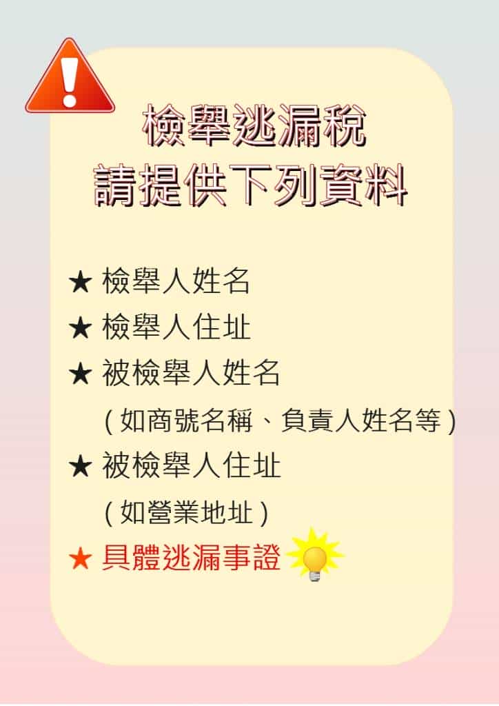 該局特別呼籲,向稽徵機關提出檢舉時,檢舉內容須具備被檢舉人姓名、地址、違章漏稅之具體事證及可供偵查之資料,另相關漏稅地點、時間、物證等,倘確實掌握,亦請一併提出,俾供稽徵機關查核。