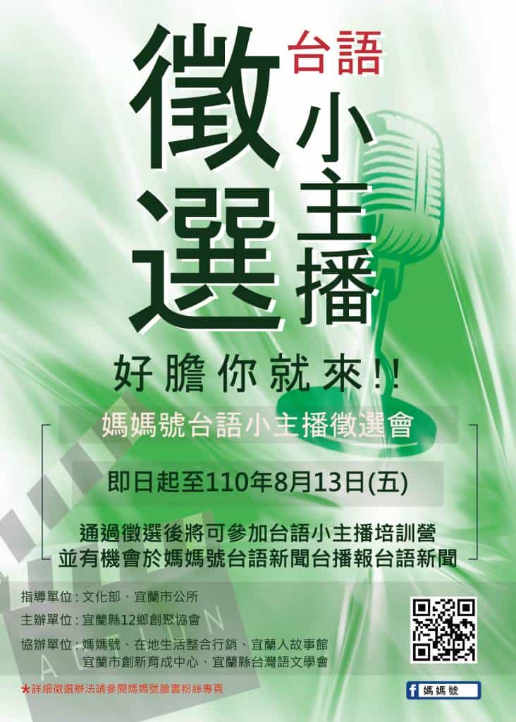 原定今年7月開始辦理的「110年台語小主播徵選與培訓營」活動,受到疫情的影響而延至8月舉行。「媽媽號台語小主播徵選會」徵選對象為宜蘭縣內國小一至五年級學生,只要自拍30秒的台語自我介紹,並上傳至報名表單,即可完成報名,報名連結如下: https://docs.google.com/forms/d/e/1FAIpQLSc3mSqAo5x9dEQuXXHnWcBM62B3lq6K_59ketvWoxLLBg7_TQ/viewform