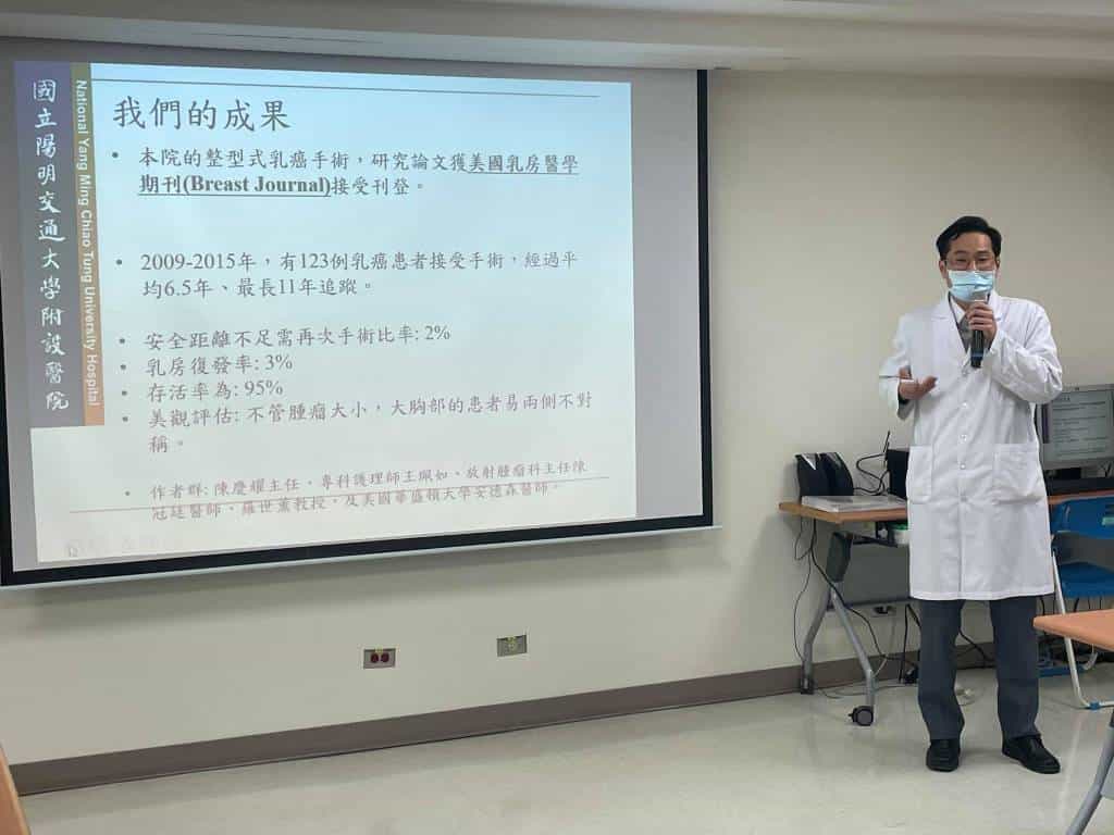 根據衛生福利部國民健康署資料顯示,乳癌為女性癌症發生率的第1位,宜蘭縣平均每兩天就有一人罹患乳癌,而國立陽明交通大學附設醫院為癌症品質認證醫院,醫療團隊為每個癌症病人量身訂定癌症治療計畫,統計至去年底,診治乳癌患者超過1,000例,乳房保留手術比率超過80%。在本院所進行的整型式乳癌手術,發現手術後因安全距離不足需再次手術比率為2%,乳房局部復發率為3%,遠優於局部挖空及擴大的手術方式。觀察期間超過十年,陽大醫院十年的乳癌手術成果由乳房外科陳慶耀主任、專科護理師王珮如、放射腫瘤科主任陳冠廷醫師、羅世薰教授,及美國華盛頓大學安德森醫師共同發表成研究論文報告,並獲得美國乳房醫學期刊(Breast Journal)刊登肯定,更加肯定該院在乳癌治療十年的成果已接軌國際。
