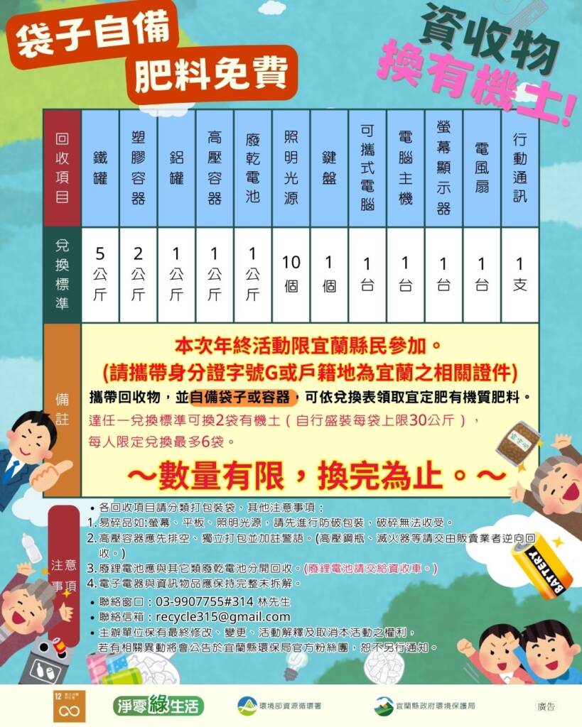 宜蘭縣環保局因應縣內廚餘回收量提升及「宜定肥有機質肥料」產能充足,將於1216日於環保局(大門口進來右轉直行至第一個空橋下)、1224日於宜蘭運動公園(南側入口)辦理2場次「袋子自備,肥料免費」資源回收兌換活動(時間0930-11301330-1530),鼓勵民眾以實際行動支持資源回收。活動採「資源回收物兌換宜定肥有機質肥料,達任一兌換標準換2袋」、「每人最多6袋(自行盛裝每袋上限30公斤)」、「袋子須自行準備,現場不提供袋子。」、「以自行裝填。」方式辦理,兌換宜定肥有機質肥料為本縣廚餘再利用產品,品質安心、安全、友善環境。