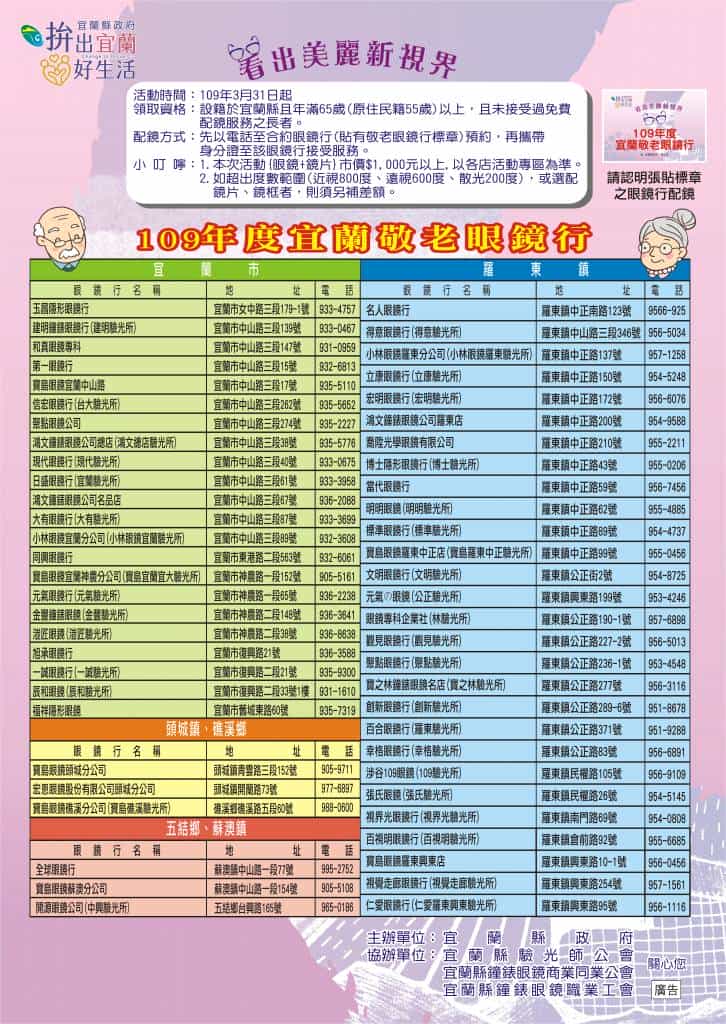 本(109)年度免費敬老眼鏡結合縣內計56家眼鏡行,凡設籍於宜蘭縣年滿65歲以上且未接受過免費配鏡服務之長者,以及55歲至64歲之原住民朋友,均可於電話預約後,持身分證至貼有「敬老眼鏡行」標章的合作眼鏡行配鏡。另外也會針對沒有眼鏡行的鄉鎮持續辦理社區巡迴篩檢配鏡服務,共同守護宜蘭長輩的視力。
