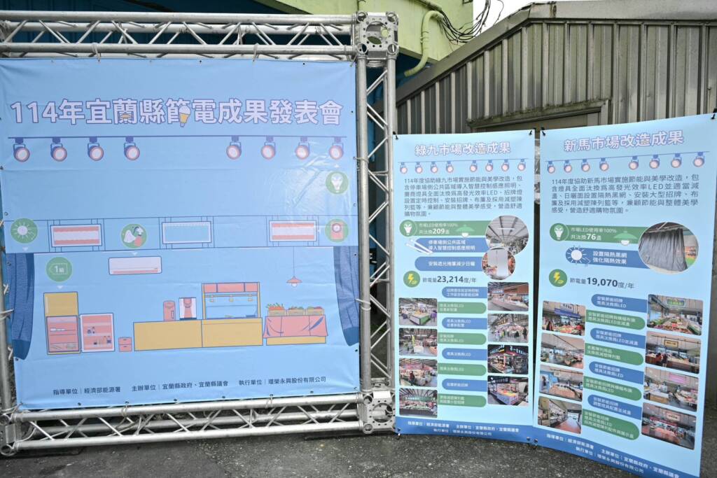宜蘭縣政府表示,為擴大推動本縣住商部門節電工作,114年度針對蘇澳鎮新馬市場及宜蘭市綠九市場2處公有市場進行節能示範改造,計有16個攤商參與。過程中邀請設備專家與美學設計團隊給予市場節能與美學改善指導並進行示範改造,包含老舊燈具全面汰換為節能LED燈具並適當減盞、停車場側公共區域導入智慧控制感應照明、市場日曬面設置加厚型隔熱網及運用布簾與大型招牌強化銷售主題等改造,合計節電效益約4萬2,284度/年。同時兼顧節能與整體美學感受,營造舒適購物氛圍。