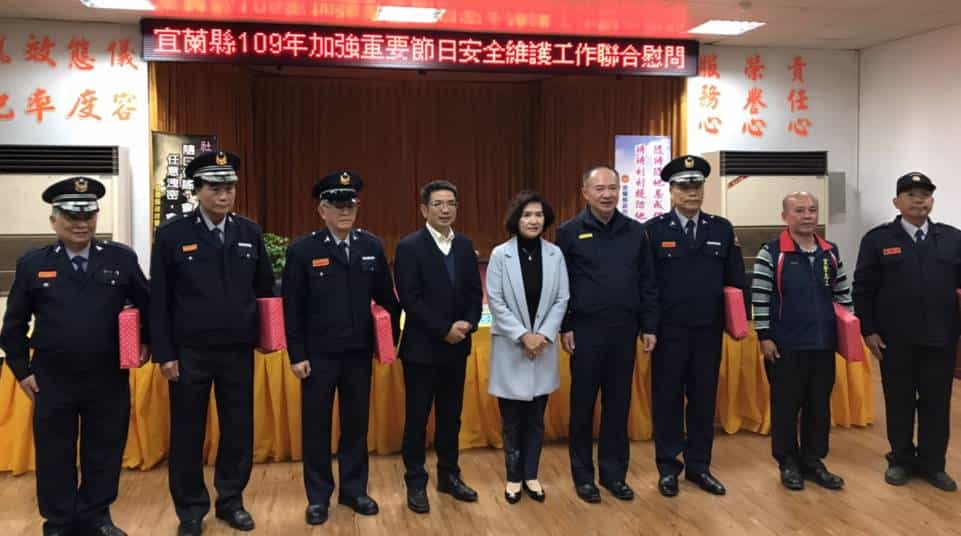「109年加強重要節日安全維護工作」自109年1月16日22時起,實施至1月30日24時止,為期15日,宜蘭縣縣長林姿妙為鼓舞各級執勤人員士氣,昨晚在警察局局長謝進賢、各民力幹部等人的陪同下,至宜蘭警察分局七樓禮堂,慰問工作辛勤的警消同仁與義警、民防、義交、志工及守望相助隊等協勤人員,並致贈慰問品,除表達感謝之意,並預祝所有堅守崗位的執勤同仁春節愉快。