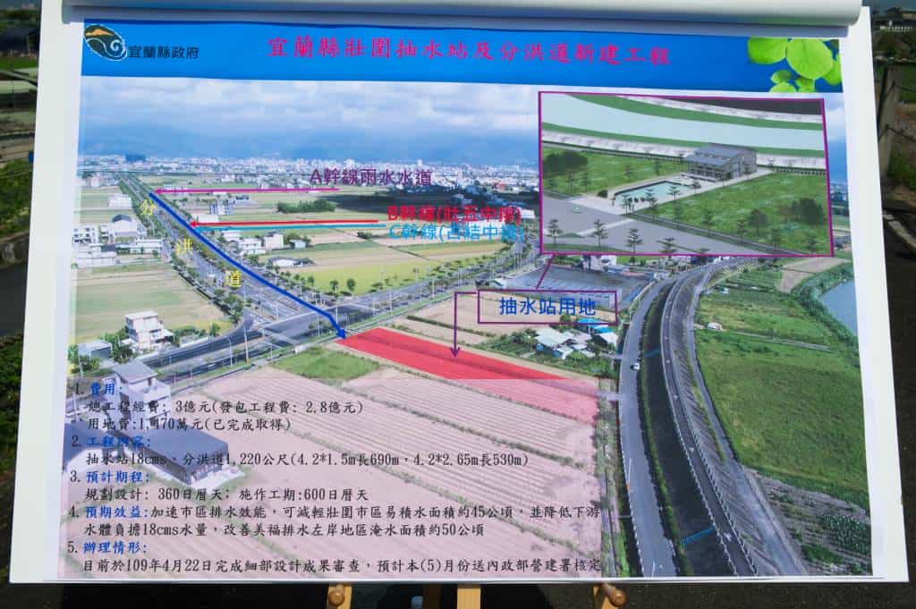 為再提升壯圍都市排水功能,進一步減輕下游低窪地區的積水情形,縣政府已爭取中央前瞻基礎建設計畫經費三億元,規劃110年初開始在縣民大道底下設置1,220公尺的分洪道,並在道路東側末端處建置壯圍抽水站 (將設置18CMS 抽水機組,運轉後每秒可抽18公噸的水),施工時間約20個月,預計於112年防汛期投入運作行列。