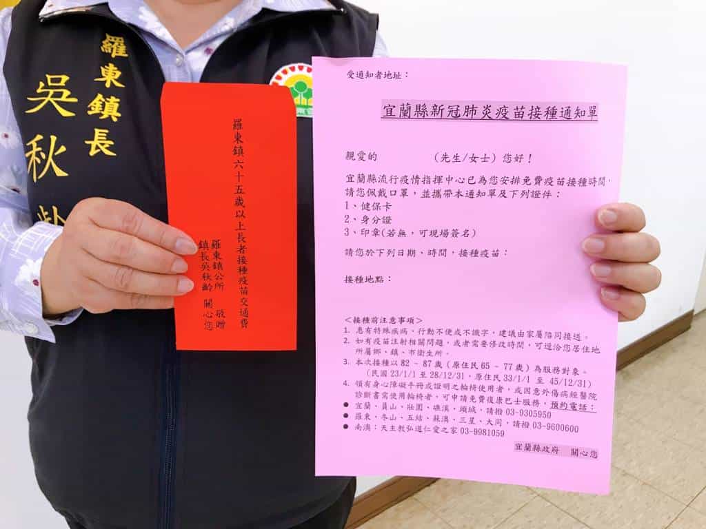 鎮長吳秋齡表示:根據指揮中心公布的接種順序,有對應時段,目前即將開始施打82至87歲長者,由公所發放通知單,羅東鎮年滿65歲以上長者約13,000多人,施打疫苗交通津貼大約2,600,000多元,公所於疫情期間,停辦相關活動支出所節省下費用,公所會將疫苗接種通知單及交通津貼200元一併交付長者手上,鼓勵長輩前往施打疫苗,也肯定長輩們一起對抗新冠肺炎疫情,全民抗疫的準備及願景已在羅東漫開。
