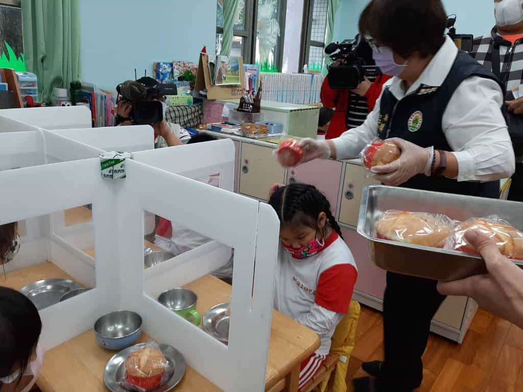 適逢小朋友點心時間,吳秋齡鎮長今天親自幫發蛋糕及倒牛奶,吳秋齡鎮長表示,待疫情過後,防疫隔板可回復翻翻書的功用,貼上孩子們美勞書面作品,讓防疫隔板功能性再加倍。