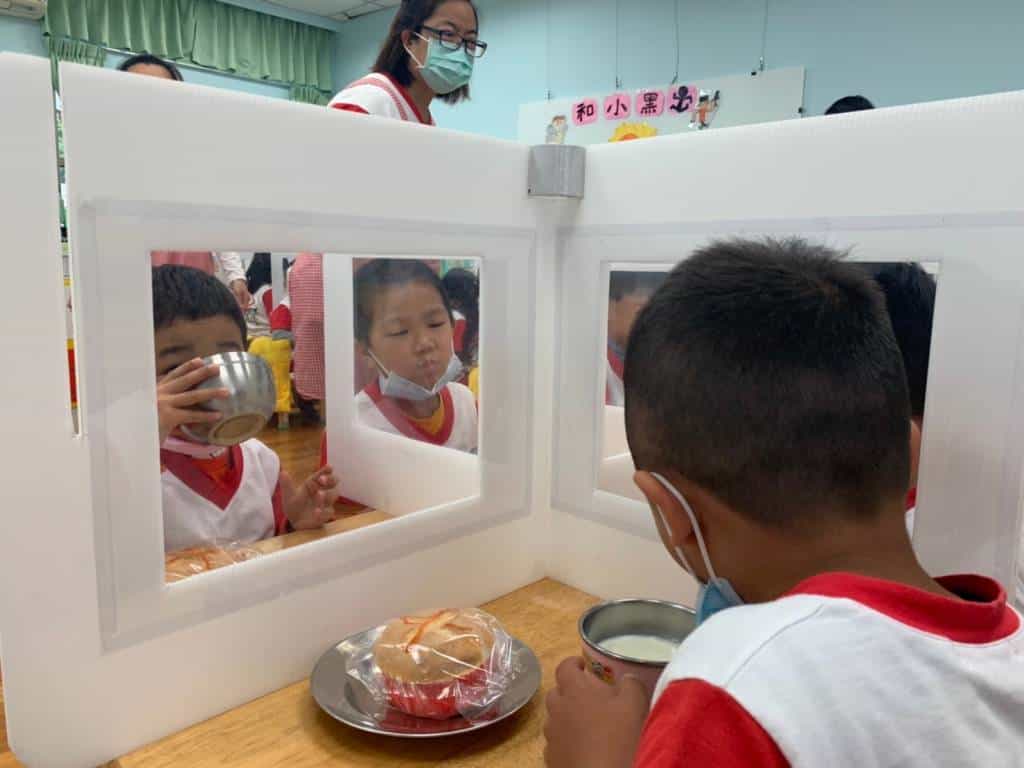 羅東鎮立幼兒園因應「嚴重特殊傳染性肺炎」社交距離防疫規範,須保持足夠的社交距離或以隔板、屏風進行區隔;為了保護每一位小寶貝用餐安全性,利用翻翻書的原理改裝成「DIY防疫隔板」,以美勞PP板及透明塑膠片材料製作,初版以美勞PP板裁切上下交叉製成隔板,因板面材質為實心面,孩子好奇時常探頭看鄰近同學,因此失去防疫效果,故更改製作第二版,板面中間挖空貼上透明塑膠片,增加板面穿透性,孩子就可看到鄰近同學也可減少空間壓迫感,用餐完畢可以酒精消毒隔板,另外提醒孩子們用餐勿交談,隔絕飛沫汙染食物,讓孩子們能安心用餐,健康成長。
