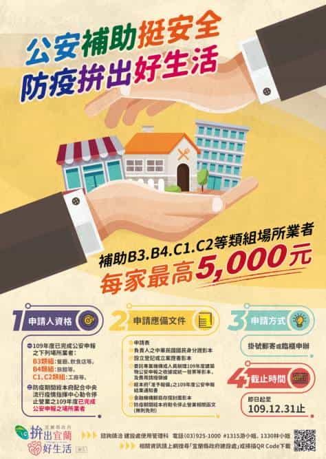 因應嚴重特殊傳染性肺炎(COVID-19)疫情對宜蘭縣社會與經濟影響重大,縣政府為體恤產業困境,協助受影響的產業渡過難關,針對本縣轄內B類商業類(B-3餐廳、飲食店及B-4旅館等)、C類工業類(C-1特殊工廠及C-2一般工廠等)及受本府配合中央流行疫情指揮中心勒令停止營業之已完成公安申報之場所業者,辦理109年度建築物公共安全檢查申報費用補助(新臺幣5,000元為上限),以減輕業者申報之負擔。