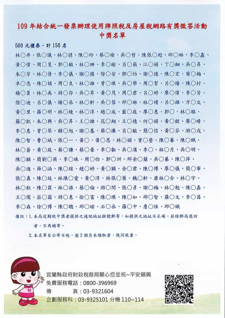 今日抽獎現場,在政風人員監抽見證下,以電腦公開方式分別抽出500元禮券150名,財政稅務局將於近期內以掛號郵寄至中獎人之通訊地址,如中獎人原始提供之地址不正確,經郵局退回者,一律不再補寄。另自中獎名單公布日起,逾2個月未領取者,視同放棄。中獎名單請上本局網站(www.iltb.gov.tw)或FB粉絲專頁查詢。