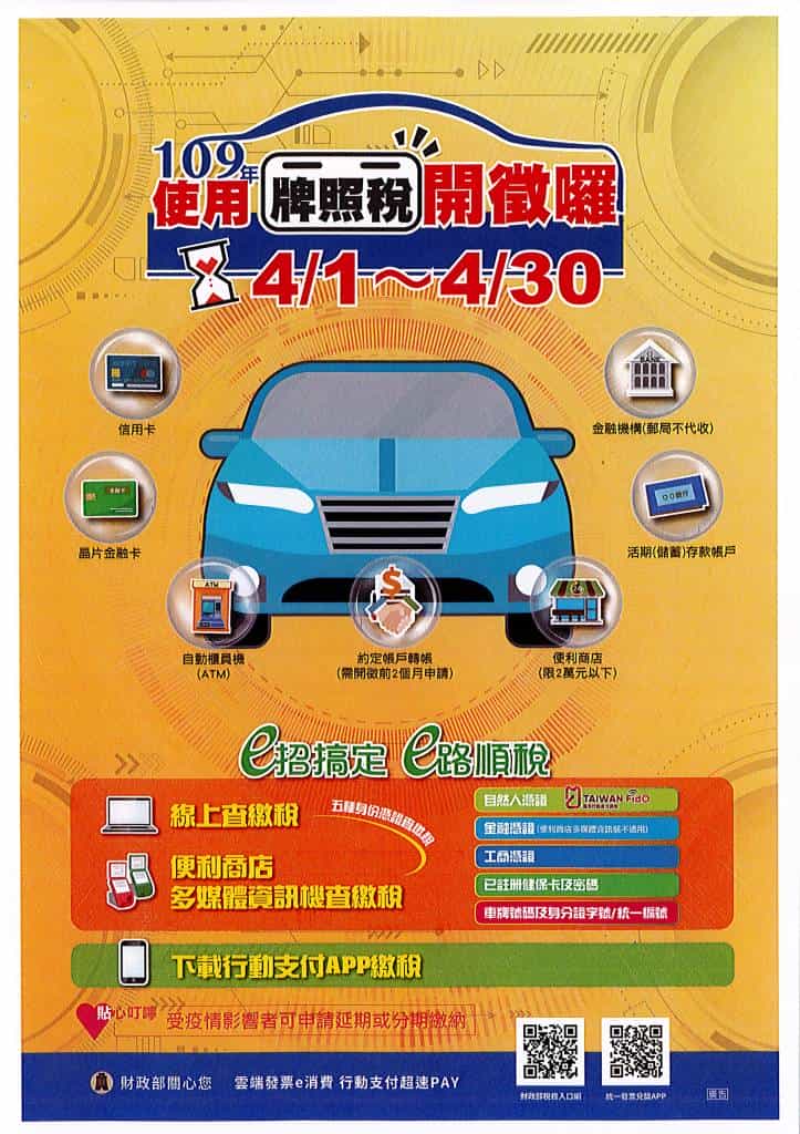 宜蘭縣政府財政稅務局表示,109年使用牌照稅繳納期限至4月30日,請如期繳納,以免逾期受罰。