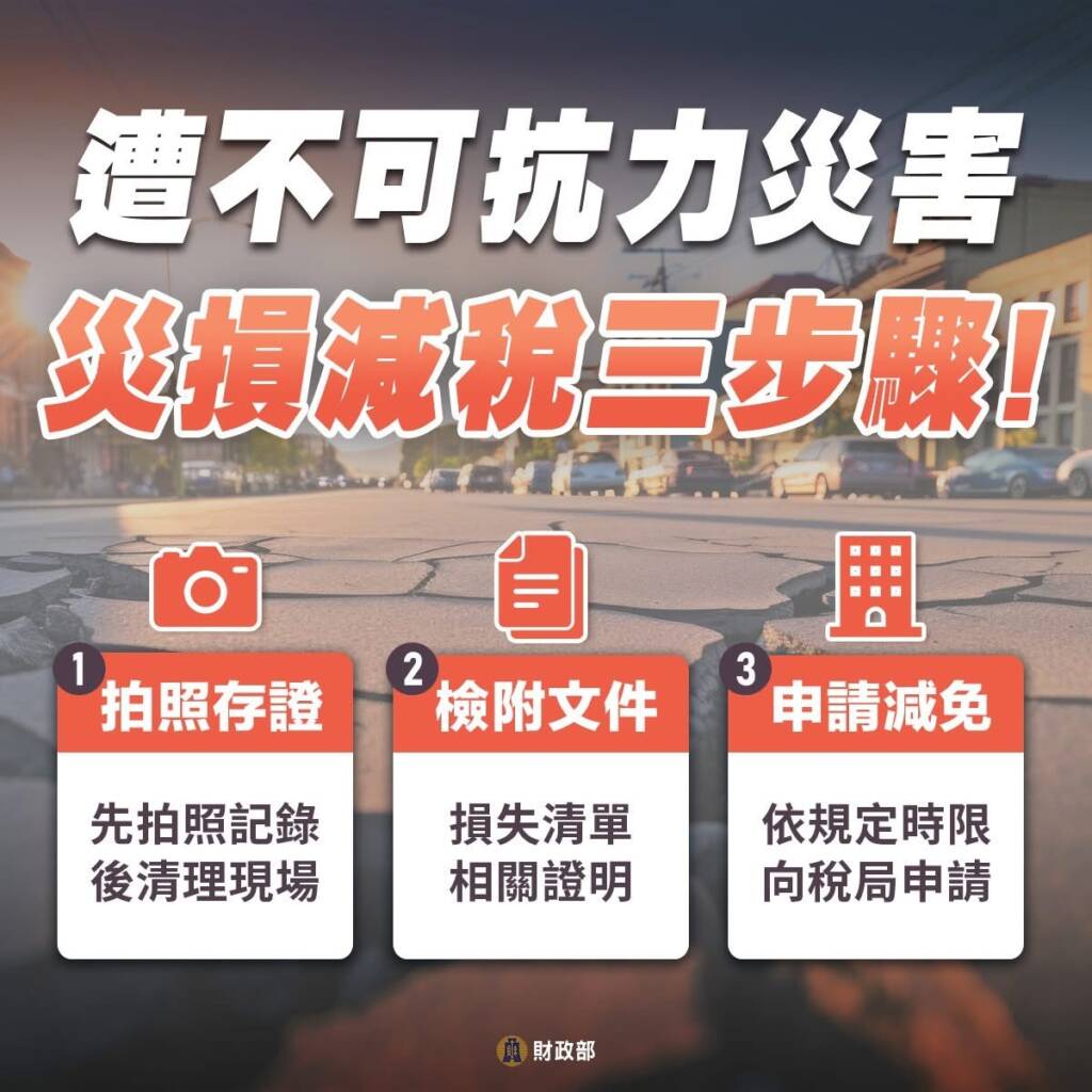 財政稅務局說明如有發生災損要牢記三步驟:1、拍照存證:第一時間先拍照保存證據。2、檢附文件:損失清單及相關證明文件(維修估價單、相片等)。3、申請減免:依規定時限向所在地國稅局或地方稅稽徵機關申請。