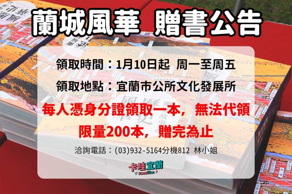 宜蘭市公所之前出版以人物為主題的《蘭城先賢》一書後,為延續在地歷史的記憶,特聘專家學者撰述以人文空間為主軸的《歷史風華》專書。此本書將特別贈送給宜蘭市內各國中小,每個班級各1本,以及發送到國內各縣市圖書館、國史館、中央研究院、國家圖書館等民眾借閱。另將準備200本贈送民眾,憑身分證向文化發展所領取,送完為止。