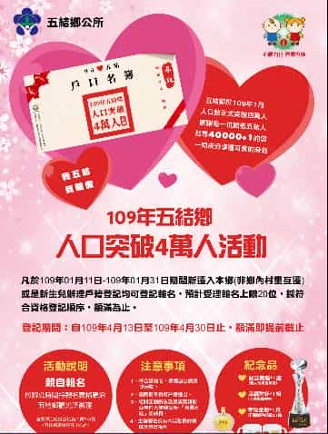 突破4萬人對於鄉公所團隊來說,是一項令人振奮的消息!為此公所特別規劃辦理《94愛五結~尋找40000+1的您》活動,凡於109年1月11日~1月31日期間,新遷入本鄉(非鄉內村里互遷)或是新生兒辦理戶籍登記者,均可登記報名。登記方式採親自報名,於109年4月13日起至109年4月30日止,請民眾於公所上班時間,持報名表格親洽五結鄉觀光所交由專人辦理,預計受理報名上限為20人,採符合資格登記順序,額滿即提前截止。報名成功者,可獲得「驕傲五結人」個人化專屬獎座一座、幸福對杯1組及「幸福金彩」(千足金鎖片)一只!禮品豐富,希望能夠藉此將新生命、新希望的喜悅散播出去,另贈獎儀式活動將擇期辦理,期待能跟民眾一同分享這驕傲的一刻。