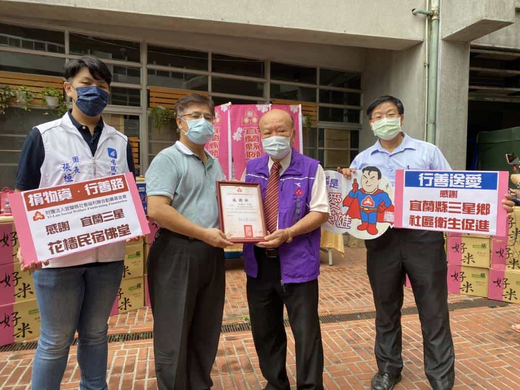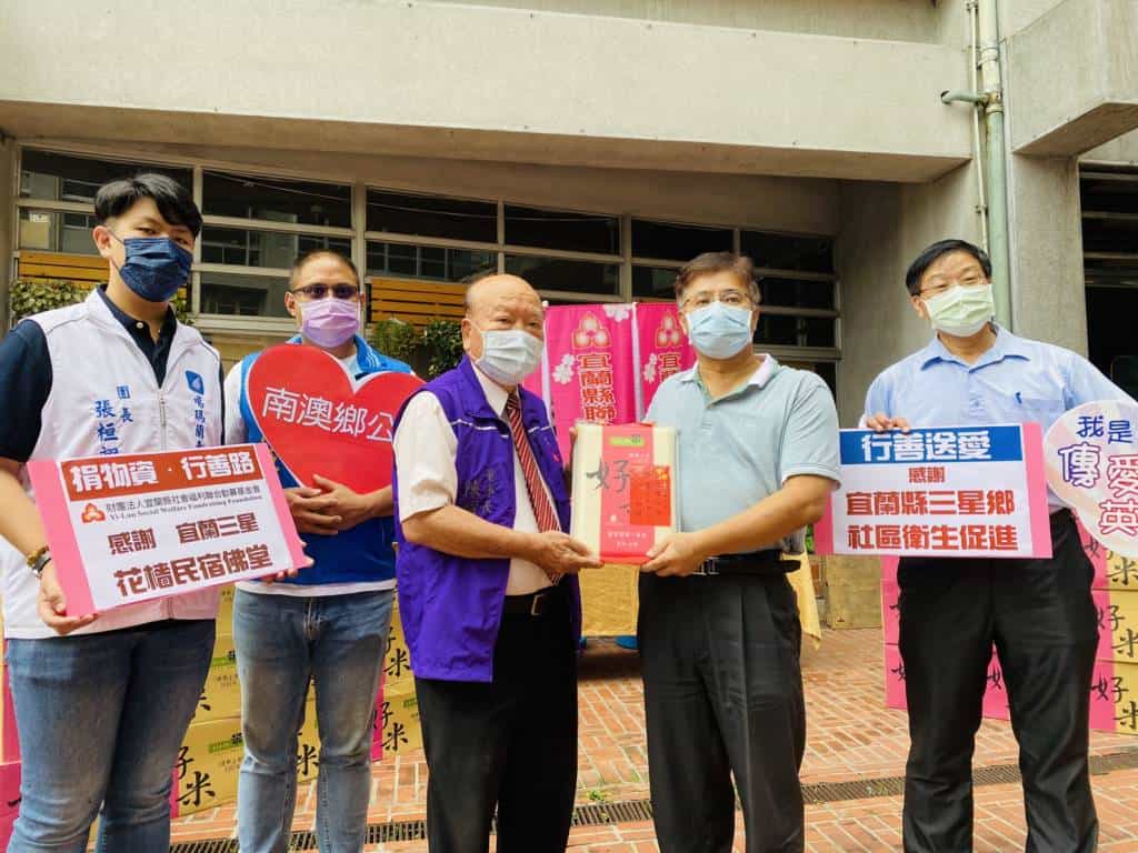 新冠肺炎疫情影響,導致弱勢家庭陷入嚴重困境,成為社會福利邊緣戶,極需社會善心人士關懷及救助。為關懷此次因為疫情受到重大影響的弱勢家庭及民眾,位於三星鄉的花檣佛堂捐贈3公斤裝善心米200包,透過三星鄉社區衛生促進會捐贈給財團法人宜蘭縣社會福利聯合勸募基金會及南澳鄉公所,分送給兩單位急需救助的弱勢家庭,以解其燃眉之急;也讓需要救助的民眾在面臨生活困境時獲得及時的關懷,感受到社會的溫暖。