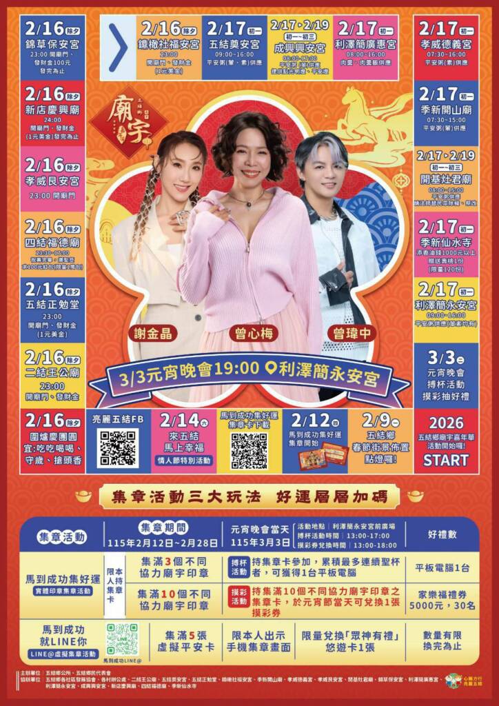 五結鄉長沈德茂表示,公所配合走尪活動,在元宵節晚上辦理廟宇嘉年華元宵晚會,邀請知名藝人馬力歐主持,曾心梅、謝金晶、曾瑋中三位藝人來和鄉民走春、同樂摸彩,也辦理親子提篙仔燈踩街。公所將以鄉下人辦喜事的人情味分享給遊客,邀請入住五結民宿、觀賞五結美麗田野景色、品嚐五結特色伴手禮。同時可以參加全國唯一曬恩愛的尪揹某趣味競賽。五結鄉公所邀請夫妻、情侶一起來慶祝情人節,揹老婆、曬恩愛,成為夫妻最美的情人節甜蜜負擔;前三名獎品是老婆等重的米,像五結的米一樣甘甜,有點黏又不會太黏,有時第二名獎品的米重比第一名還多,形成夫妻間趣談,比賽期間太太要不要減重搶第一名呢?還是多增重增加獎品的重量,成為鄉民的趣談。