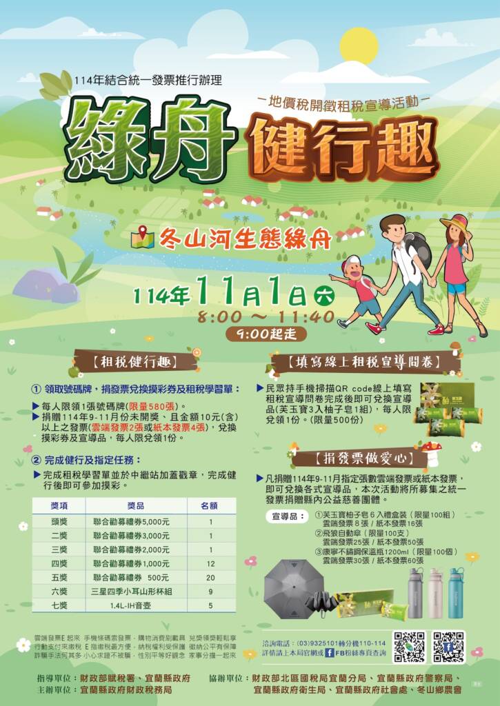 宜蘭縣政府財政稅務局將於114年11月1日(星期六)上午8時,在冬山河生態綠舟舉辦「綠舟健行趣」地價稅開徵暨租稅宣導活動,邀請民眾踴躍參加,共度歡樂時光。
