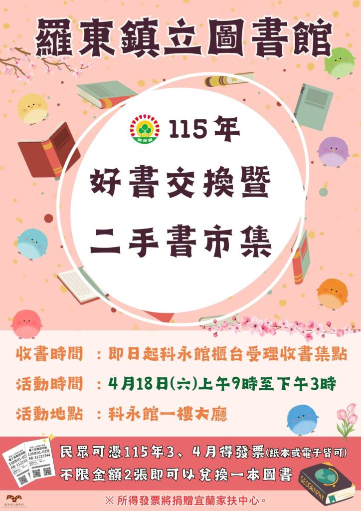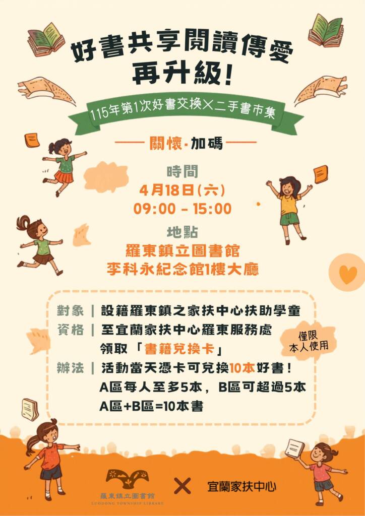 為推廣閱讀風氣並結合公益行動,羅東鎮立圖書館將於418日(星期六)上午9時至下午3時,在李科永紀念館一樓大廳舉辦「115年第1次好書交換×二手書市集」活動。今年活動特別攜手宜蘭家扶中心合作,除延續往年好書交換機制外,更進一步擴大公益參與,讓閱讀的力量溫暖更多需要的家庭。
