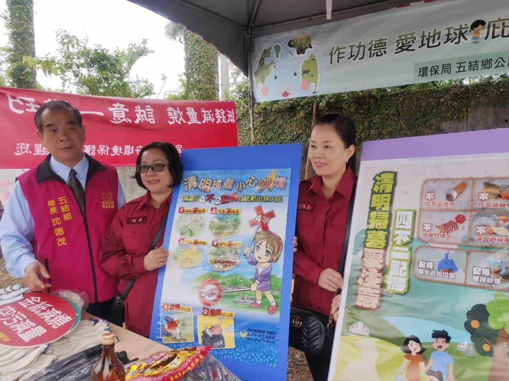 4月4日將是鄉親攜家帶眷清明節祭祖高峰期,預計將有4千至5千人湧向該鄉4處公墓祭祀追思祖先。隨著新冠肺炎疫情的不斷升溫,沈鄉長十分重視所有返鄉祭祖鄉親的身體健康,公所為做好服務並避免民眾掃墓對疫情傳播的疑慮,除於6個服務台提供75%酒精供掃墓民眾消毒外,也提醒民眾自備口罩保護個人健康,另公所除了委請防火宣導隊加強墓區用火安全外,亦製作了「清民祭祖、小心火燭」的宣傳品來提醒鄉親共同注意,五結鄉清明尚安全。