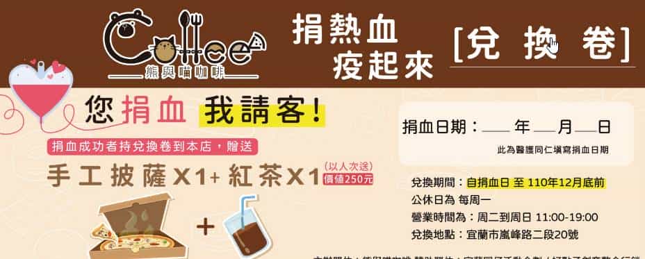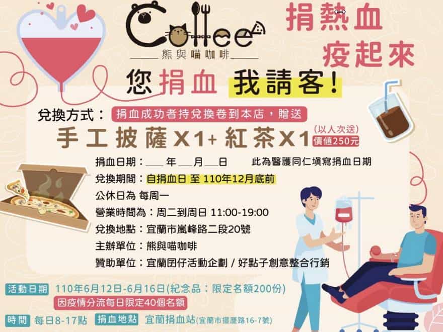呼籲一出,在地青創餐飲業者「熊與喵咖啡」感念市長號召,立即連繫宜蘭捐血站要來提供200份的餐飲抵用卷作為響應,「熊與喵咖啡」負責人蘇宏明表示:「雖然餐飲業者在這一波疫情當中受到很大的衝擊,但是看到江聰淵市長的呼籲後,對於同時身為宜蘭市商家及宜蘭市創新育成中心進駐廠商的一份子,成長與茁壯都是宜蘭鄉親的支持與協助,因此儘管目前經營狀況受限疫情,但是秉持著飲水思源的理念,希望透過這樣的舉動來拋磚引玉,不只鼓勵民眾參與捐血,更希望透過這樣的方式,團結大家來共度疫情難關。」