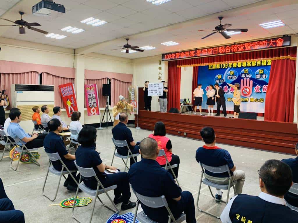 暑假期間,少年流連妨害身心健康場所之機會增加,為保護少年,預防遭受污染發生偏差行為,宜蘭縣政府統合各局處組成「聯合稽查小組」,於暑假首日7月14日晚間在警察局舉行聯合稽查誓師大會,會中並由「蘭陽戲劇團」以傳統藝術戲曲結合宣導重點、詼諧逗趣演出展現執法意志;並在縣長林姿妙及警察局局長謝進賢等局、處長的帶領下,齊聲高呼「無毒家園、拒絕飆車、殲滅幫派、遠離霸凌、掃蕩色情、杜絕詐欺」等口號,展現縣府全面保護青少年之決心。
