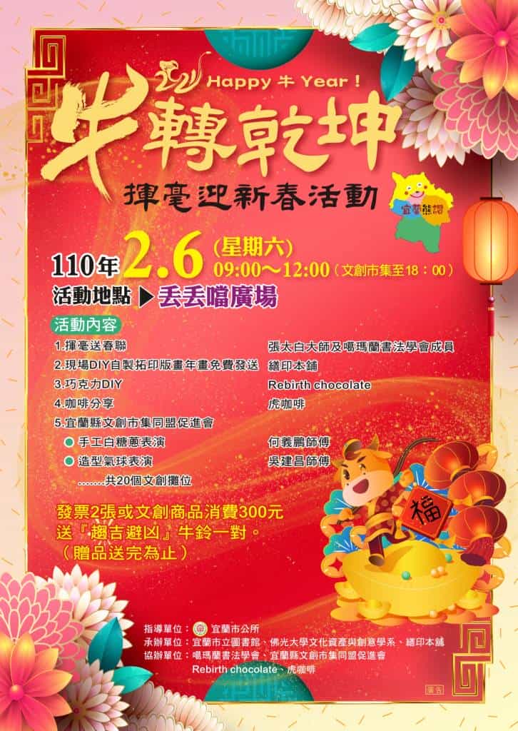 「新年到 好運到 春暖花開好運兆」為迎接新的一年,宜蘭市公所於110年2月6日(六)上午9時至12時在丟丟噹廣場舉辦「110年Happy 牛Year!〝牛〞轉乾坤揮毫迎新春」活動。希望藉由喜氣洋洋的紅色春聯讓家家戶戶感受新春喜慶的過年氛圍。「春聯」是新年春節的專屬「對聯」,屬於民俗文學,具有藝術、教育及娛樂功能,「年畫」意喻「趨吉避凶、招財納福」傳統的美術工藝結合現代化媒材,畫題更由傳統神靈信仰演化為符合現代化時尚氛圍的藝術表現,張貼代表喜慶及祝福的春聯賀新年,祈福新的一年萬象更新,好運連連。
