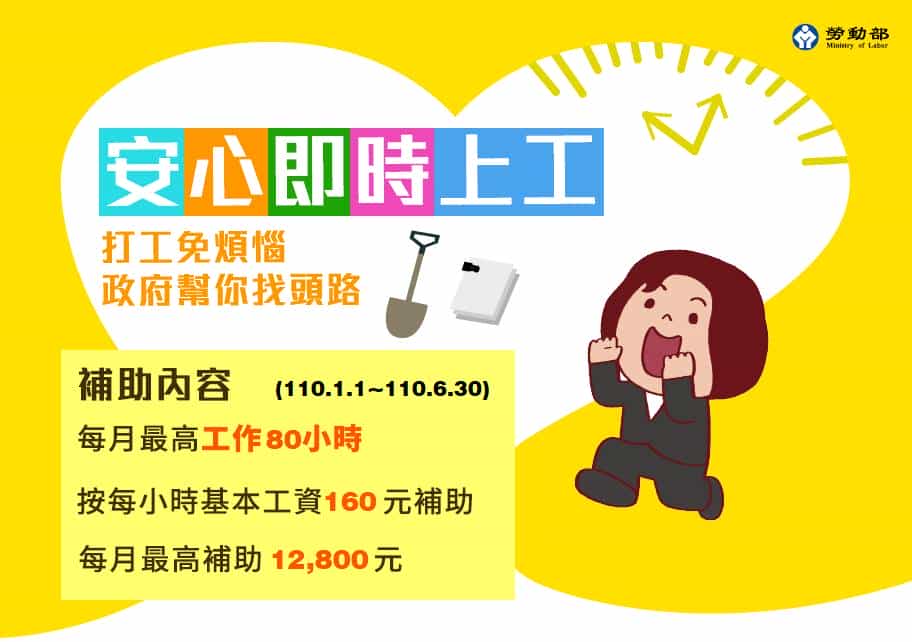 縣府表示,因應衛福部秋冬防疫專案上路,特別增加公部門部分工時職缺,爭取中央補助,持續為有需要的宜蘭非典型勞動者開拓工作機會。符合申請資格,每月最高可上工達80小時。依110年實施每小時基本工資160元計,每人每月可領12,800元。申請資格為申請登記日前1年內,有勞保或就保投保紀錄者即可參加。縣政府將於每日18時前於勞工處網站-就業/職訓快訊公告職缺明細,有意應徵者可於即日起持身分證件及資格認定文件前往各鄉鎮市公所或縣政府勞工處就業服務台面試。