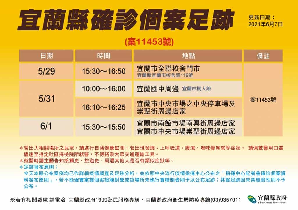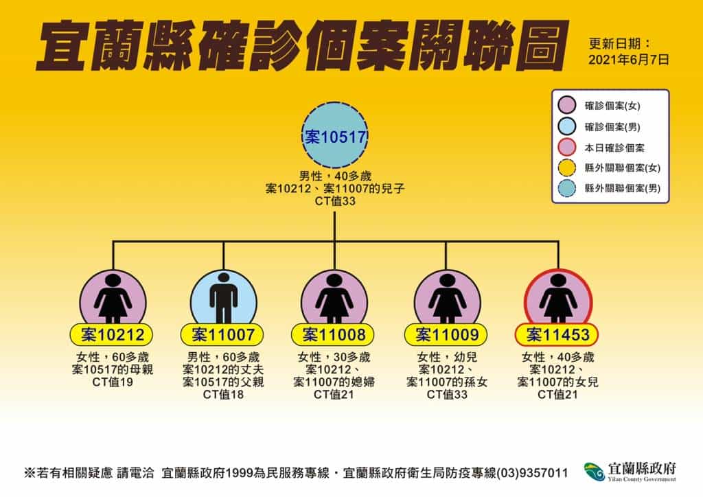 至於今(7)日確診的案例,案11453是40多歲女性,案10212號及11007號的女兒,之前曾案10517號同住10212被確診後也被匡列為居家隔離對象6月3日採檢為陰性,但自6月5日發生發燒、喉嚨不適及腹瀉等症狀,6月5日做第二次採檢,結果為陽性而確診,CT值21。